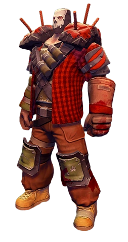 Berg is a middle-aged man with short brown hair and a large amount of stubble. His face is completely covered with a black skull mask. He wears the same button-up he wears in his Survivor form, but wears a black t-shirt instead of white. He wears orange cargo pants with the same boots as his Survivor form. He also has two pieces of concrete with three rebar attached to his shoulders, which are secured with two belts crossing his chest, with the left strap having three cylinders attached to it. On his biceps and knees, he has hockey guards on. He wears one of his gloves from his Survivor form on his left arm, and has a piece of green fabric wrapped around his right arm, secured with white packing tape. Underneath the shoulder straps, he has green body armor over the shirt.