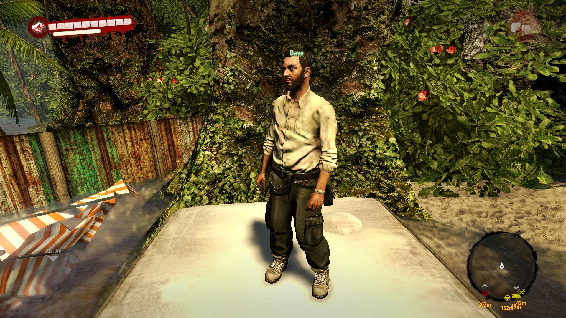 Dave is a survivor featured in Dead Island: Riptide. He is first met by the Heroes in Mataka Village, where he introduces himself as a movie director, and tasks the heroes with retrieving his video camera and camera battery from the zombie-infested movie set, giving the side quest Genre: Horror Slasher. He is later encountered again in Halai Village on the roof of a building with his camera set up to finish his movie, where the hero must kill a Thug while Dave films the act in order to save the ending to his movie, giving the side quest On the Set. Dave disappears after this with no more quests, leaving his ultimate fate unknown.
