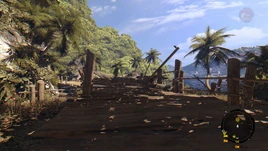 The road itself is intact, what's destroyed here is the wooden bridge linking it. A river runs through the area as a tall ravine and before the outbreak a wooden bridge was erected to give roadway access from the jungle to the rest of Palanai Island. However, because of the storm and monsoon, the bridge has been destroyed and a large tree has blocked the jungle side of the bridge. It's a large gap to try and cross by other means, though the road on the other side seems clear of debris.