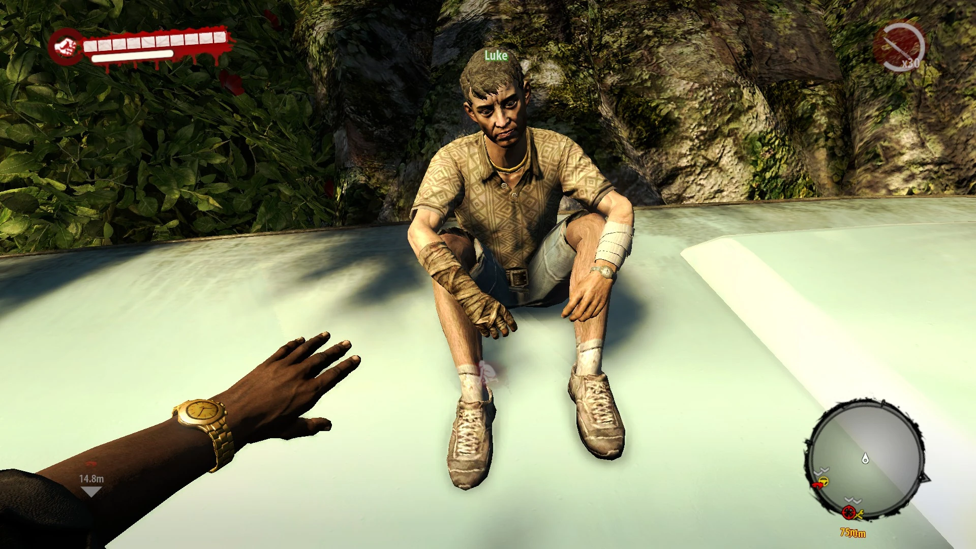 Luke eventually spots the heroes and calls for help. As soon as the heroes spot Luke, the civilian rescue quest Rescue Luke is activated. After killing the zombies, he calls the hero up to the top of the camper and gives them cash as a reward, saying that they will need it more than he does. He rests on the top of the camper for a while before leaving the area to find somewhere safe.
