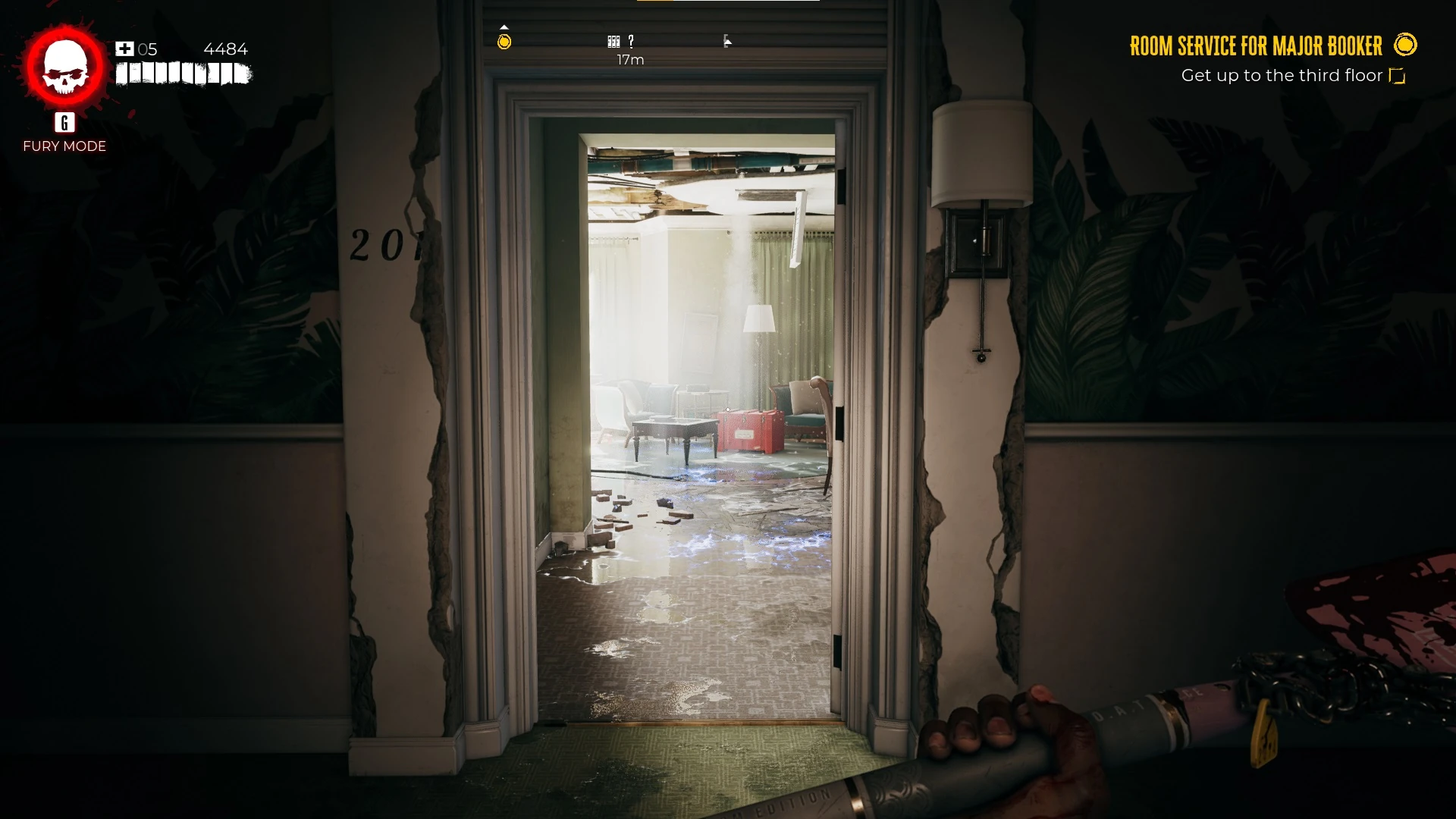 Room 201 is a location featured in Dead Island 2. It is a room on the second floor of the Halperin Hotel, which has been damaged by the earthquakes. The resulting quake has caused the back wall to collapse, exposing it to the elements, as well as blocking the bathroom door completely. Collapsing ceiling debris has wrecked the room considerably, ruining most furniture and covering the ground in water and dangerous live wires, electrifying the whole room.