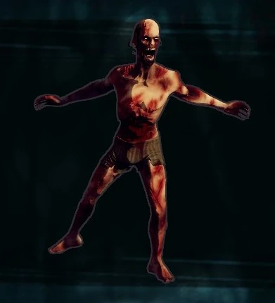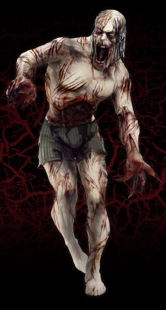 Sirens are, much like Bouncers, quite naked in their appearance. They have no shirt, no shoes and no trousers, with just a pair of boxer shorts covering them. They are also covered in countless, deep, bloody scratches. (Inferring from their idle animation, these are likely self-inflicted.) Their hands have been mutated and turned into long, sharp claws that are covered in blood, while their hair has mostly fallen out, leaving them nearly bald.